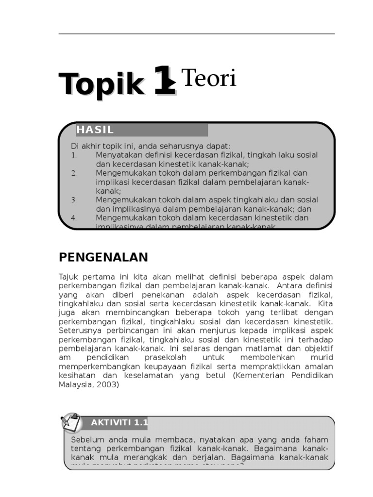 25112012 Perkembangan fizikal kanak-kanak sejak lahir hinggaberusia 6 tahun adalah tahap tumbesaran yg sangatpentingIa melibatkan perubahan berat badan ketinggian saizbadan rangka tulang. Menurut kurikulum Prasekolah Kebangsaan Kementerian Pendidikan Malaysia 2003 perkembangan fizikal kanak-kanak boleh dibahagikan kepada empat bahagian iaitu kebersihan alam sekitar keselamatan kesihatan dan psikomotor. Mereka juga boleh dilibatkan dalam aktiviti permainan dan latihan-latihan seperti berenang gimnastik untuk menguatkan otot daya tahan serta membina pergerakan yang lebih cekap.