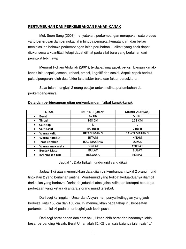 11102014 Pada tahun-tahun selepas merdeka terutama pada tahun-tahun 1960-an gerakan proaktif anak-anak muda kampung ini banyak membantu pembangunan fizikal bahkan menjadi contoh kepada persatuan-persatuan belia di mukim TPG dan Kuala Langat umumnya. Abstrak Perkembangan pesat di bandar menyebabkan penduduk Melayu kampung bandar secara sukarela atau terpaksa berhadapan. Perkembangan fizikal kanak-kanak ini adalah merupakan perkembangan dan perubahan yang berlaku ke atas fizikal seseorang yang merangkumi pertumbuhan fizikal iaitu dari segi perubahan saiz badan dan kepala kandungan badan pertumbuhan gigi dan rangka tulang serta dari segi kemahiran pergerakan motor iaitu motor kasar dan motor halus serta pengawalan dominan.