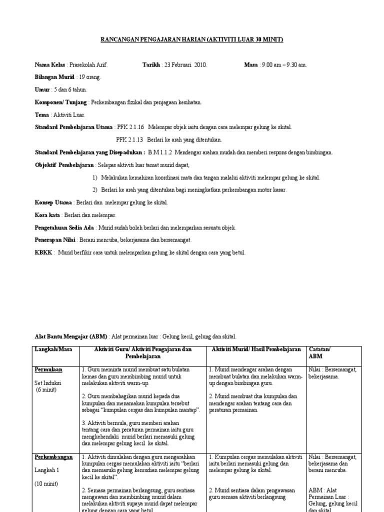Rancangan pengajaran fizikal permainan luar. 3 1 menguatkan otot fizikal dengan memantapkan motor halus di mana murid boleh melakukan aktiviti ini secara individu. Pendidikan Jasmani Tarikh. Kemahiran Hantaran Tajuk.