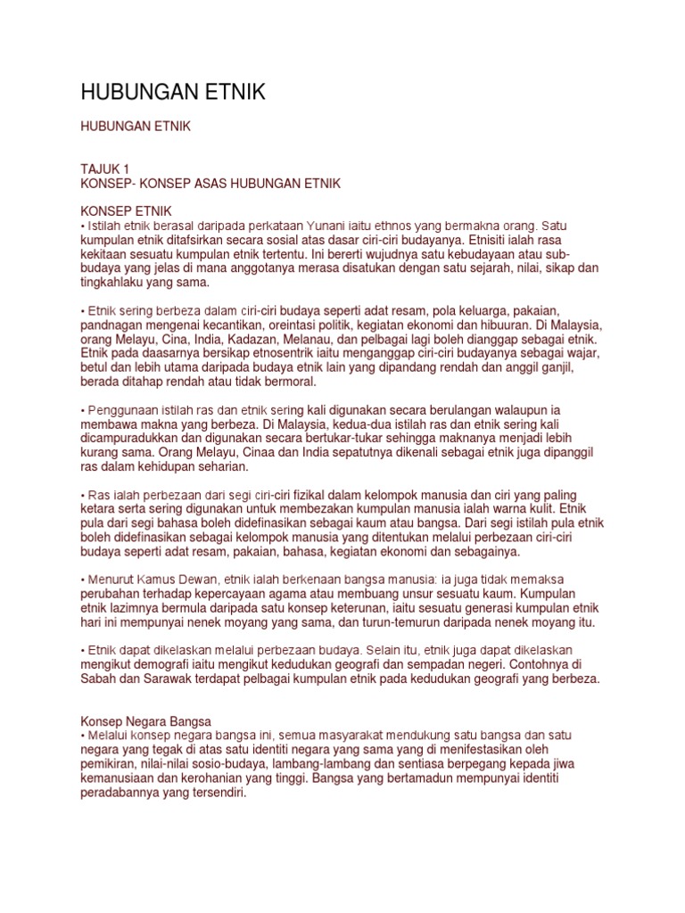 Konsep suku merupakan kelompok masyarakat yang membentuk rumpun bangsa contohnya dalam rumpun kadazandusun terdapat sub etnik seperti Tatana Bisaya Lotud Kimaragang dan sebagainya. Ciri-Ciri Kumpulan Ras Kumpulan manusia yang terdiri daripada lelaki dan perempuan yang berkongsi ciri-ciri biologi tersendiri yang diwarisi dan dapat dibezakan dengan jelas dalam masyarakat Macionis 1998 Manusia pernah dibahagikan kepada kategori Caucasoid Mongoloid Negroid dan Australoid dengan berdasarkan perbezaan fizikal seperti warna kulit warna rambut dan rupa bentuk Menurut Academic American Encycopedia Vol. Ras atau bangsa perbezaan fizikal atau sifat2 biologi A.