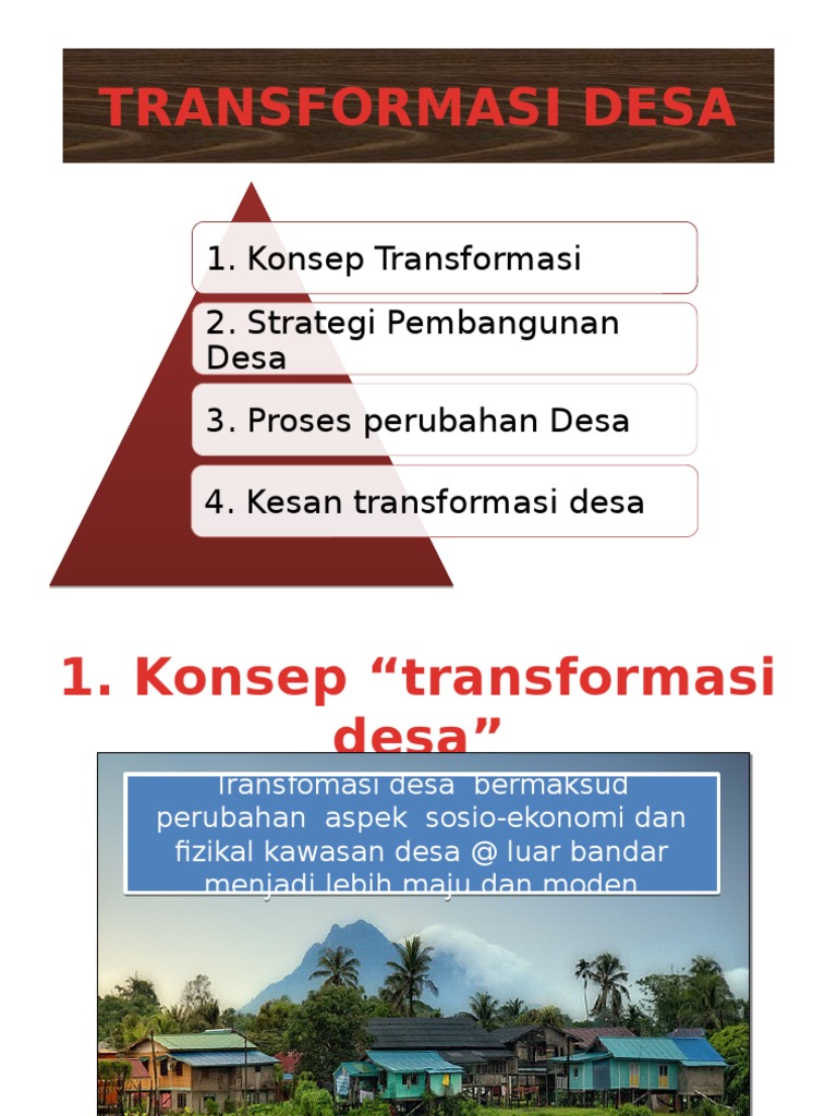 Perkembangan tersebut mempengaruhi perubahan berbagai aspek terutama di kampung kota. Pusat Pertumbuhan Desa ialah pusat pembangunan wilayah terkecil dalam sesebuah kawasan. Perubahan bentuk sifat dan fungsi tersebut dapat diartikan sebagai sebuah transformasi.