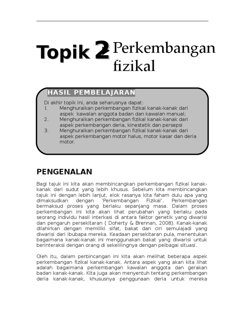 Topik ini melihat perkembangan awal kanak-kanak dalam proses perubahan yang dialami oleh kanak-kanak dari segi fizikal. Apa itu Perkembangan Fizikal. Setiap manusia yang normal akan mengalami perubahan dan perkembangan dari aspek fizikal sosial kognitif dan emosi sejak mereka dilahirkan sehinggalah menjadi remaja dewasa dan tua.