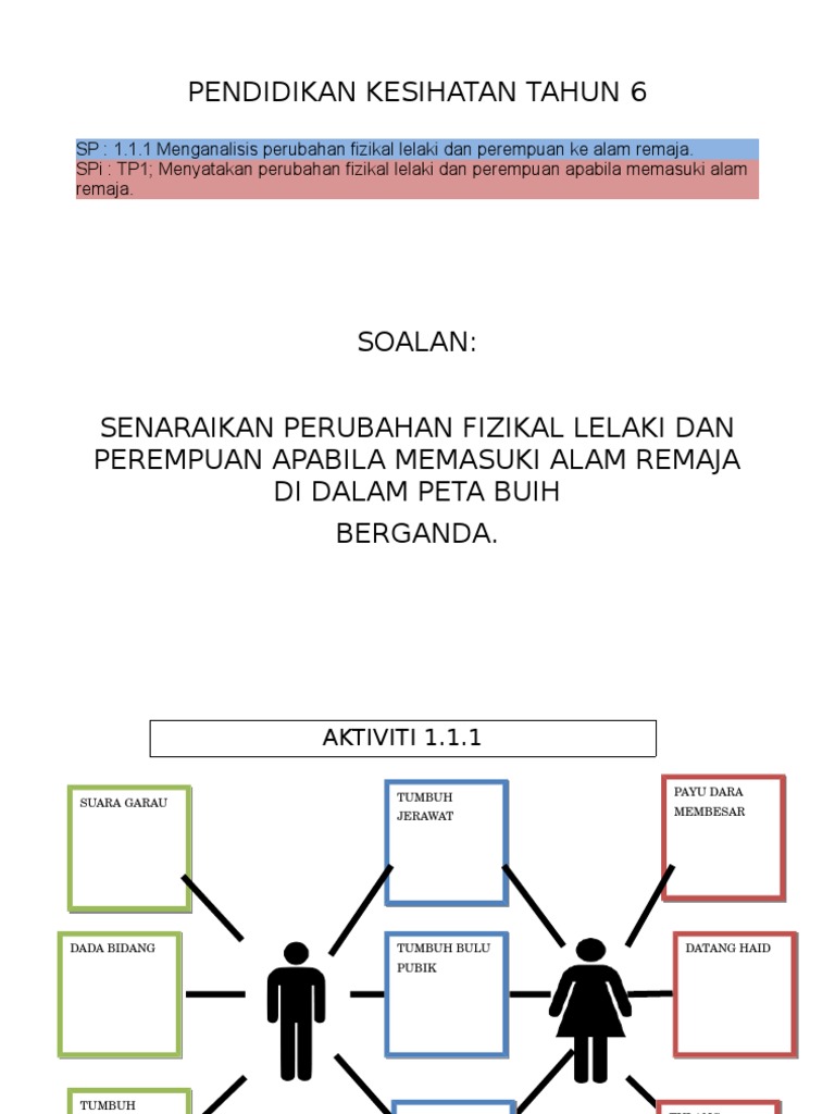 An hour ago by. Pendidikan kesihatan tahun 6 Otros contenidos. KESIHATAN DIRI DAN REPRODUKTIFSTANDARD PEMBELAJARANMenganalisis perubahan fizikal lelaki dan perempuan ke alam remaja1.