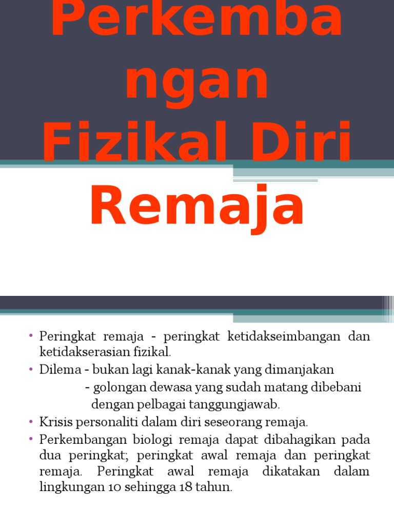 PERKEMBANGAN FIZIKAL REMAJA DRAFT. De Brun pula mendefinisikan remaja sebagai tempoh pertumbuhan antara kanak-kanak dengan. Perubahan fizikal juga mampu mempengaruhi emosi dan psikologi remaja dimana zaman inilah yang menjadi penentu masa depan dan kehidupan diri mereka.