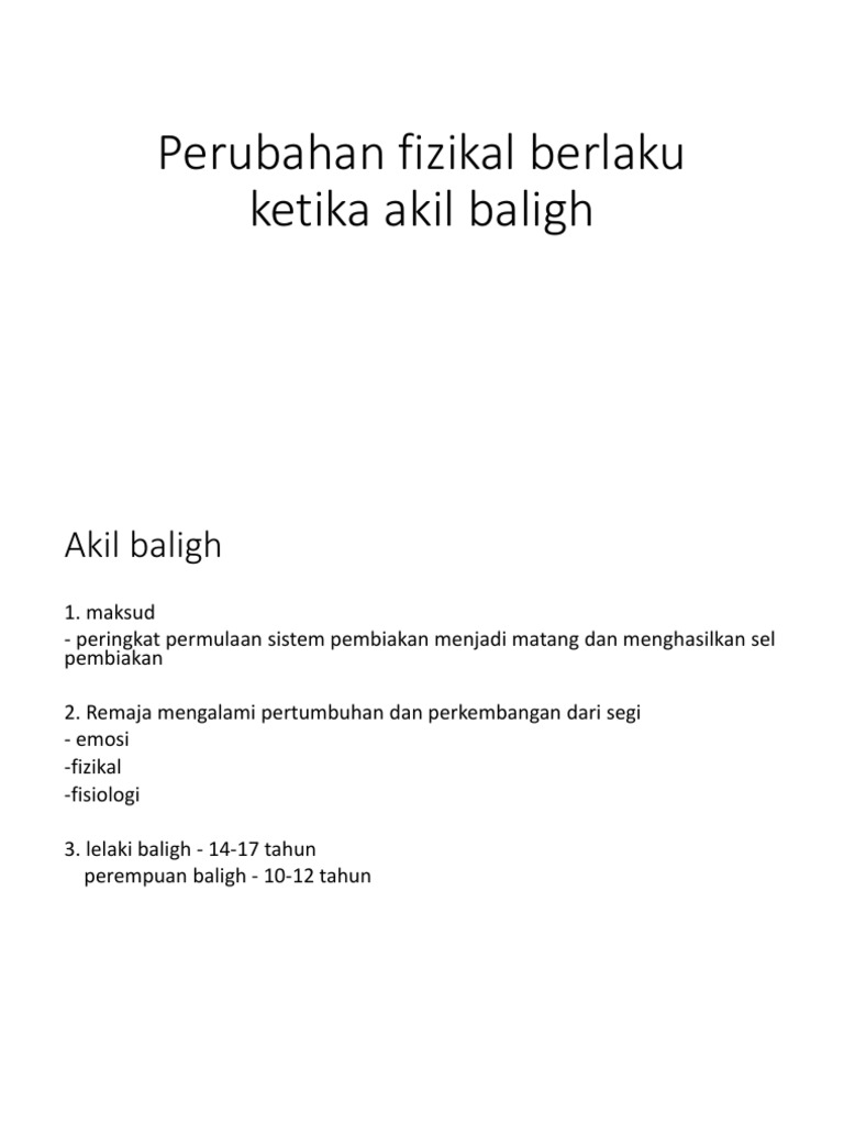 Pada masa itu badan kamu akan mengalami perubahan fizikal dan perubahan hormon dengan cepat. Akil Baligh Portal Myhealth. Ia disebabkan bahan kimia di dalam badan yang dipanggil hormon.
